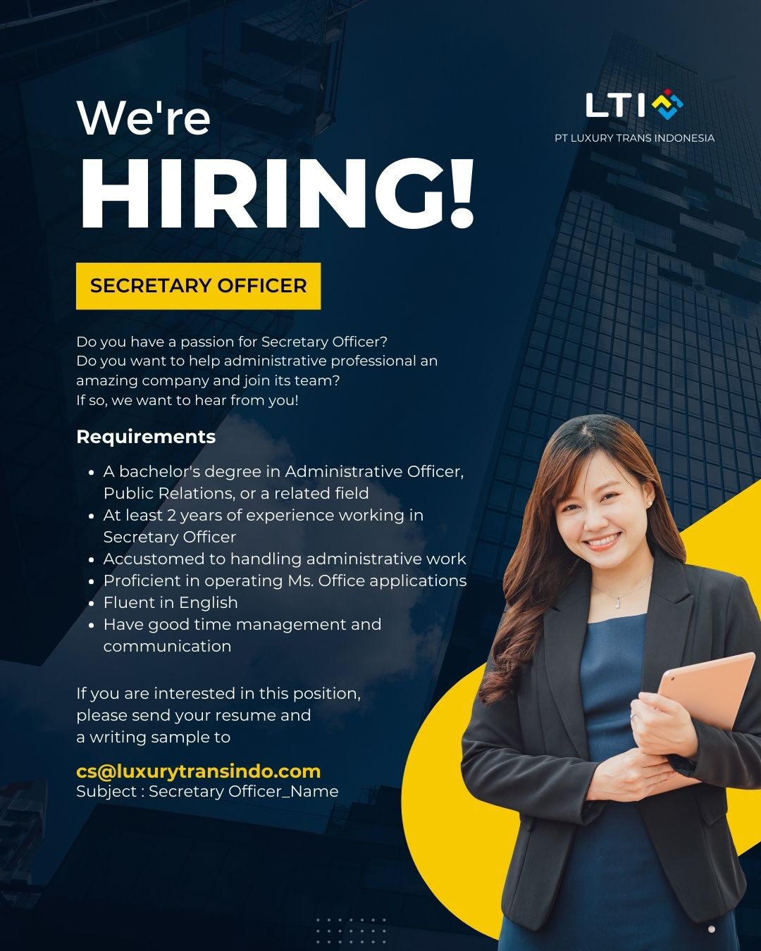 #secretaryofficer #secretary #LTI #Sekertaris #luxurytransindonesia #jobvacancy #jobopportunity #jakartajob